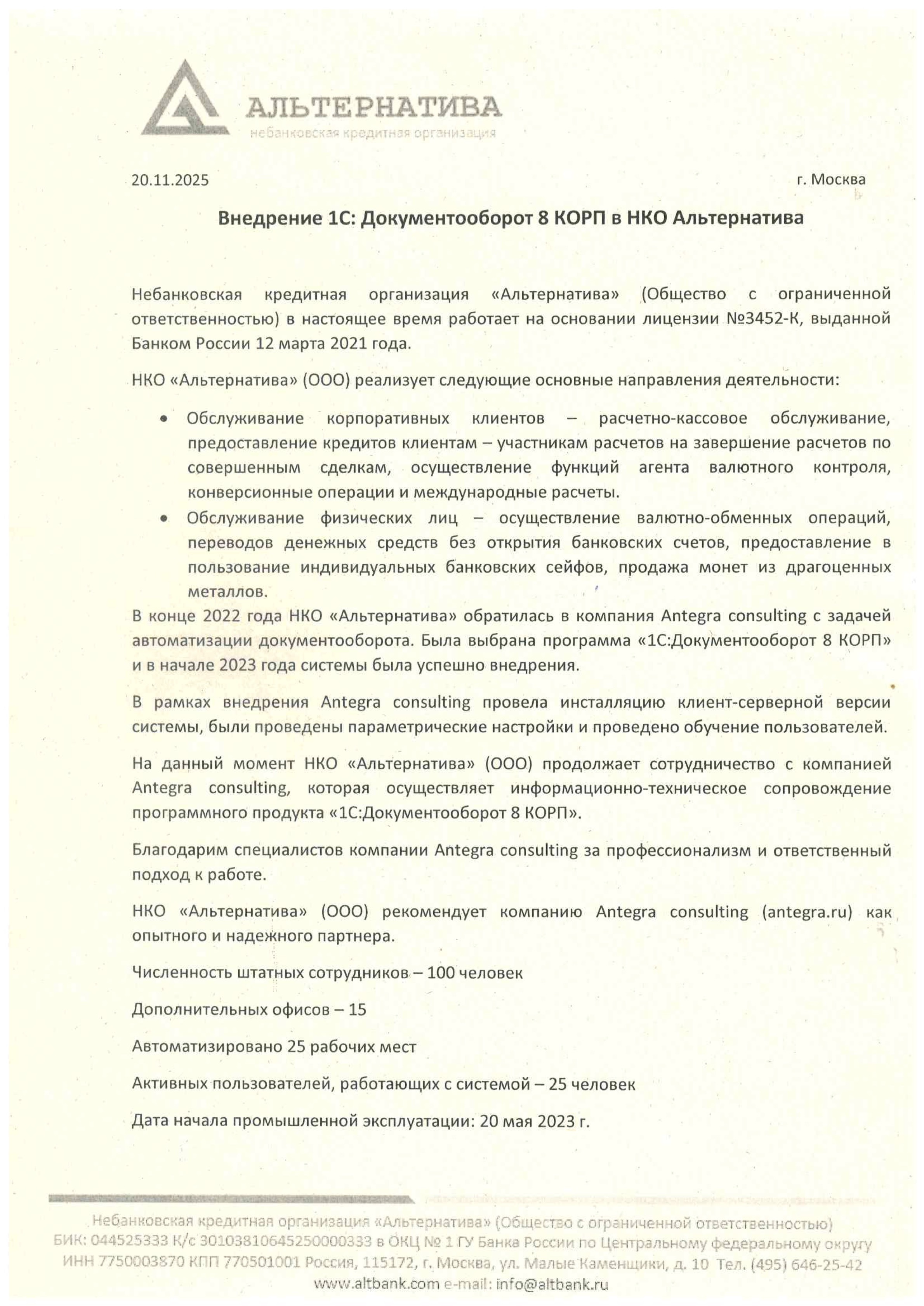 На данный момент НКО «Альтернатива» (ООО) продолжает сотрудничество с компанией Antegra consulting, которая осуществляет информационно-техническое сопровождение программного продукта «1С:Документооборот 8 КОРП».